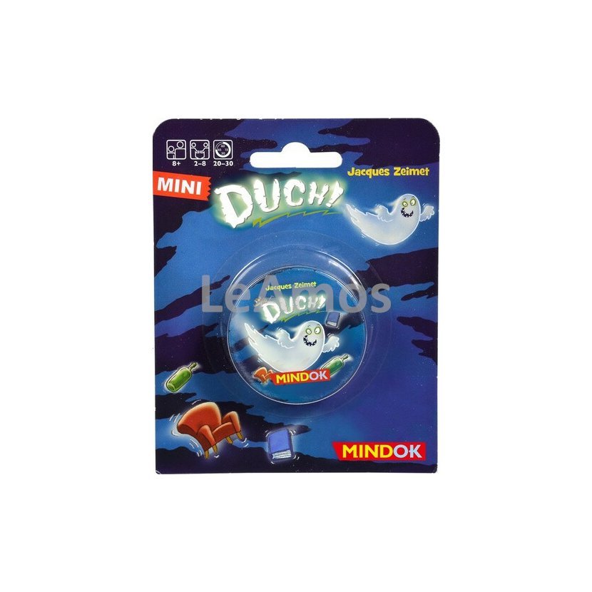 Bleskurychlá postřehová hra pro 2 – 8 hráčů. Myš! Kniha! Křeslo! Láhev! Duch! Ve hře je 5 různých dřevěných předmětů – bílý duch, zelená láhev, modrá kniha, červené křeslo a šedá myš. Na kartách jsou obrázky těchto předmětů, ovšem ne vždy ve správných barvách. Hra obsahuje 2 varianty – jednodušší a náročnější. Příklad: Na kartě je modrý duch a červená myš. Ve hře žádný modrý duch, ani červená myš nejsou. Cílem je tedy vzít (zelenou) láhev, protože na kartě není zobrazena ani láhev, ani zelená barva. Tentokrát je hra zabalená v praktické malé plechovce, kterou si snadno vezmete kamkoliv na výlet!